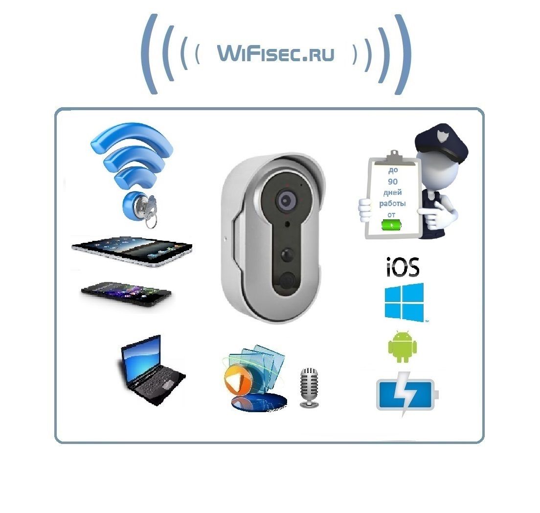 Вызывная панель видеодомофона работает по WiFi каналу и полностью автономна. Встроенный аккумулятор позволяет длительное время работать устройству в автономном режиме (до 90 дней).. Монитором наблюдения является Ваше мобильное устройство (смартфон или планшет IOS/Android). Ночное видение включается автоматически с наступлением сумерек. В устройство встроен видеорегистратор (карта памяти до 64 Гб - покупается отдельно), это позволяет фиксировать все события на память карты. Встроенный PIR сенсор постоянно контролирует движения в зоне обзора видеопанели - 5 метров и даёт готовность устройству для работы (включения) при вызове. По сработке детектора Вы сможете активировать получение фото на мобильное устройство. Дистанционное открытие электронного замка с мобильного. Интерком-связь с кативным подавлением шума.