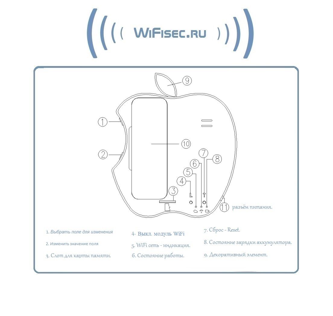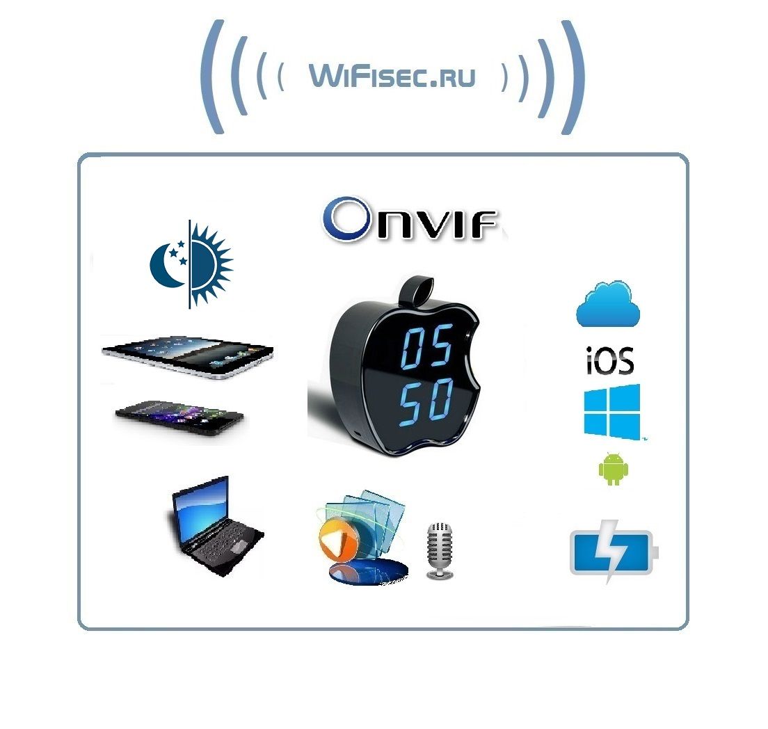 Видеоняня/охранная видеокамера DE-WWI-A720_v2 с интерфейсом работы по WiFi каналу. Уникальное исполнение в виде электронных настольных часов (Apple). Возможность записи на micro SD карту аудио и видео (карта памяти в комплект не входит). Встроенный аккумулятор позволяет автономно работать устройству до 2 часов в штатном режиме при отсутствии питания в сети 220 В. Просмотр и управление с мобильных устройств на базе ОС Android/IOS. Устройство имеет свою WiFi сеть. Вы сможете подключиться к устройству напрямую и работать с ним. После интеграции в Вашу локальную WiFi сеть, будет доступен сервис P2P (Возможность просмотра с любой точки земли через интернет не имея выделенного IP). Ночное видение. Встроенный микрофон и динамик. Просмотр через ВЭБ клиент + софт для ПК. Интеграция с сетевыми IP видеорегистраторами по протоколу ONVIF.
