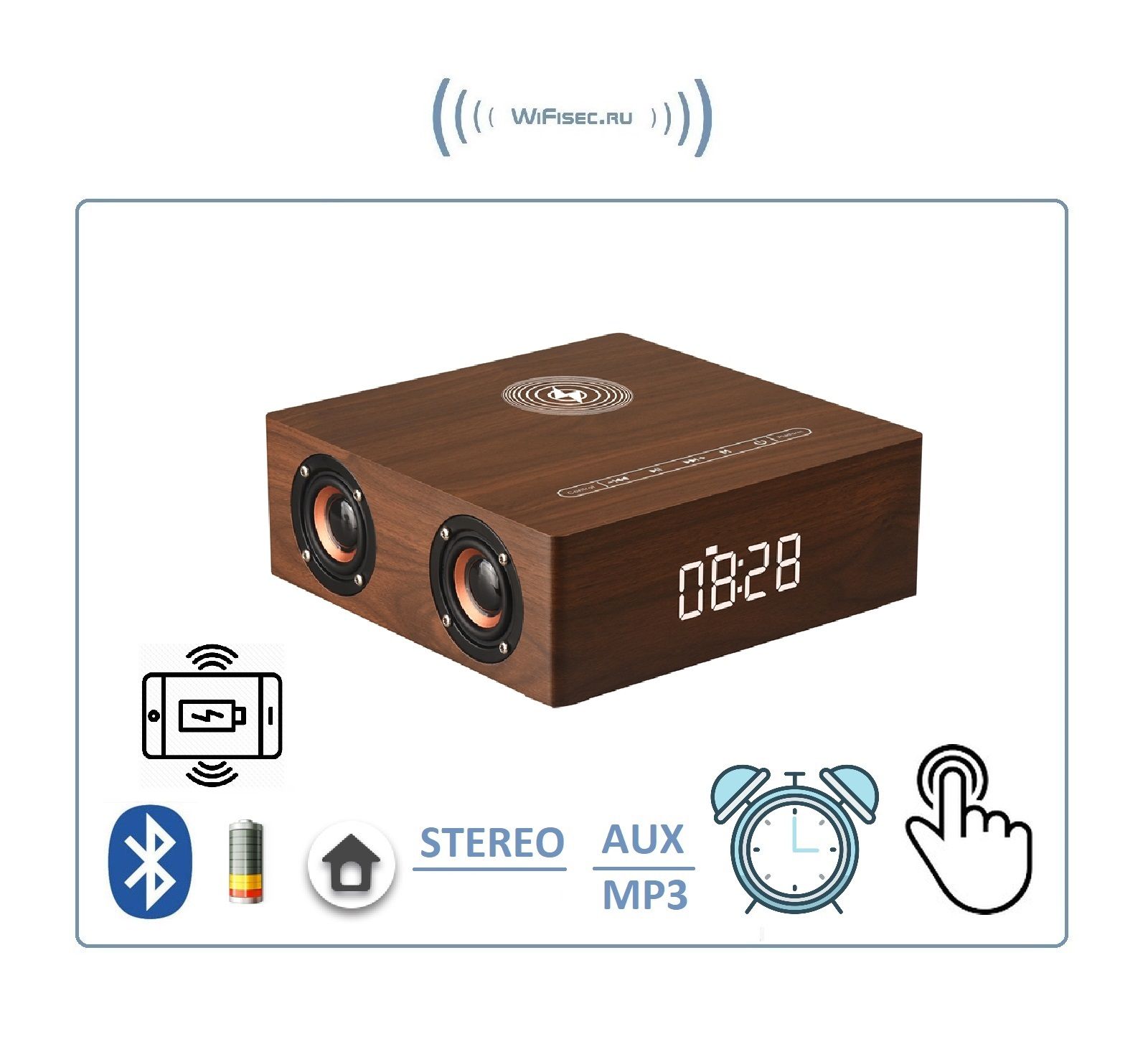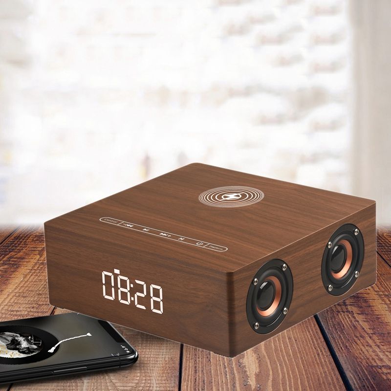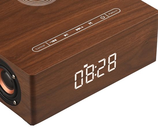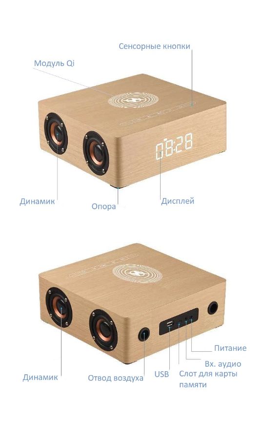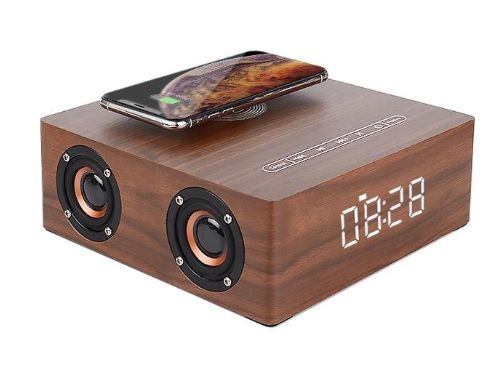 Bluetooth колонка СТЕРЕО, с информатором времени/будильник, зарядная беспроводная станция для мобильных, с аккумулятором для использования в помещении
