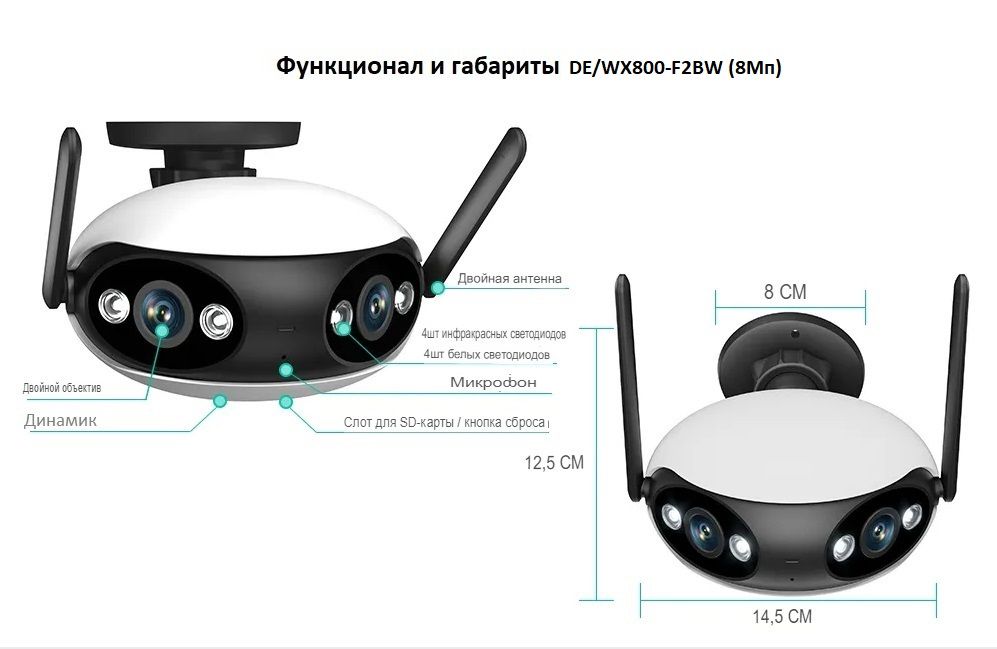 DE/WX800-F2BW (8Мп) - это простая и удобная в использовании уличная беспроводная Wi-Fi/LAN IP-камера с панорамным обзором 180 град. и 2 объективами по 4 Мп каждый (8 Мп) Full HD качеством видео, встроенный видеорегистратор (поддержка карт до 128 Гб. С технологией P2P (работа без статического IP-адреса, с функцией двусторонней аудиосвязью (динамик+микрофон) и ИК/световой подсветкой для ночного видения.