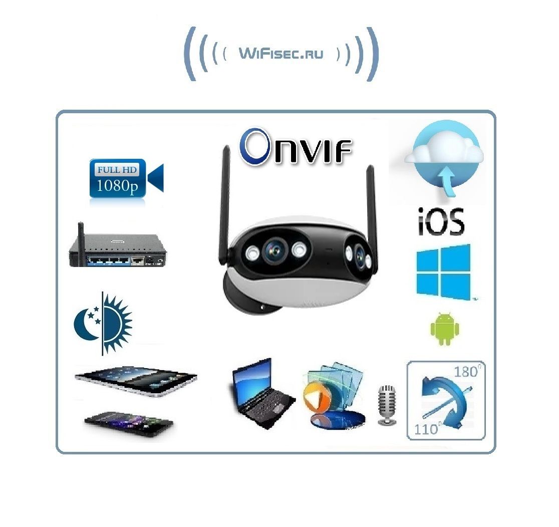 Камера поддерживает простое подключение к мобильному устройству, а также протоколы RTSP и Onvif 2.4 для подключения к регистраторам и сервисам наблюдения.