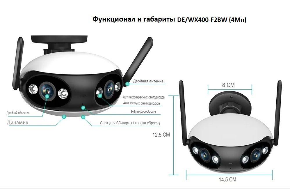DE/WX400-F2BW (4Мп)) - это простая и удобная в использовании уличная беспроводная Wi-Fi/LAN IP-камера с панорамным обзором 180 град. и 2 объективами по 2 Мп каждый (4 Мп) Ultra HD качеством видео, встроенный видеорегистратор (поддержка карт до 128 Гб. С технологией P2P (работа без статического IP-адреса, с функцией двусторонней аудиосвязью (динамик+микрофон) и ИК/световой подсветкой для ночного видения.