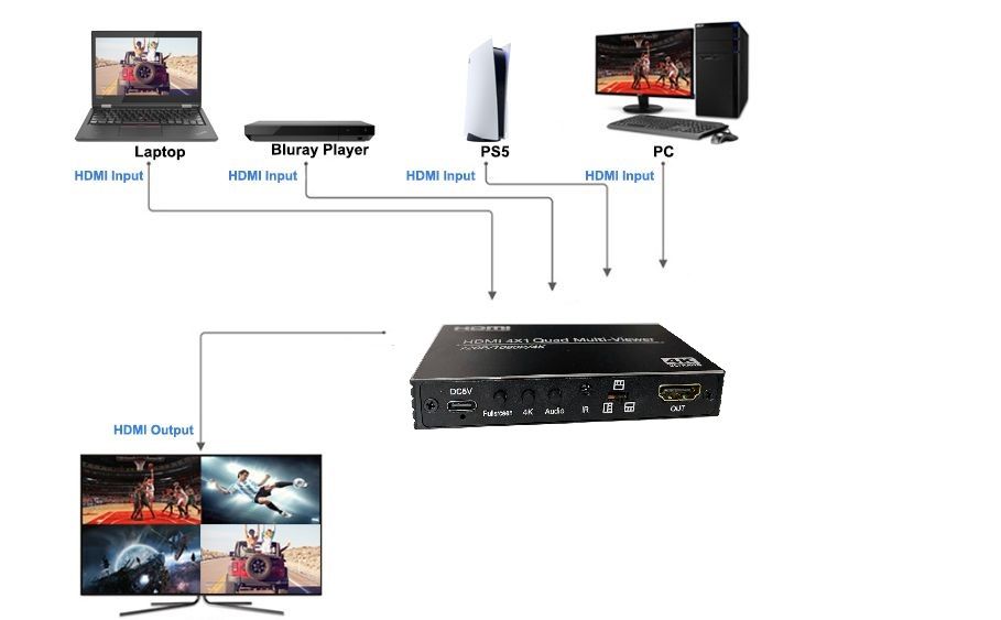 Поддерживает 4 входа HDMI и 1 выход HDMI.