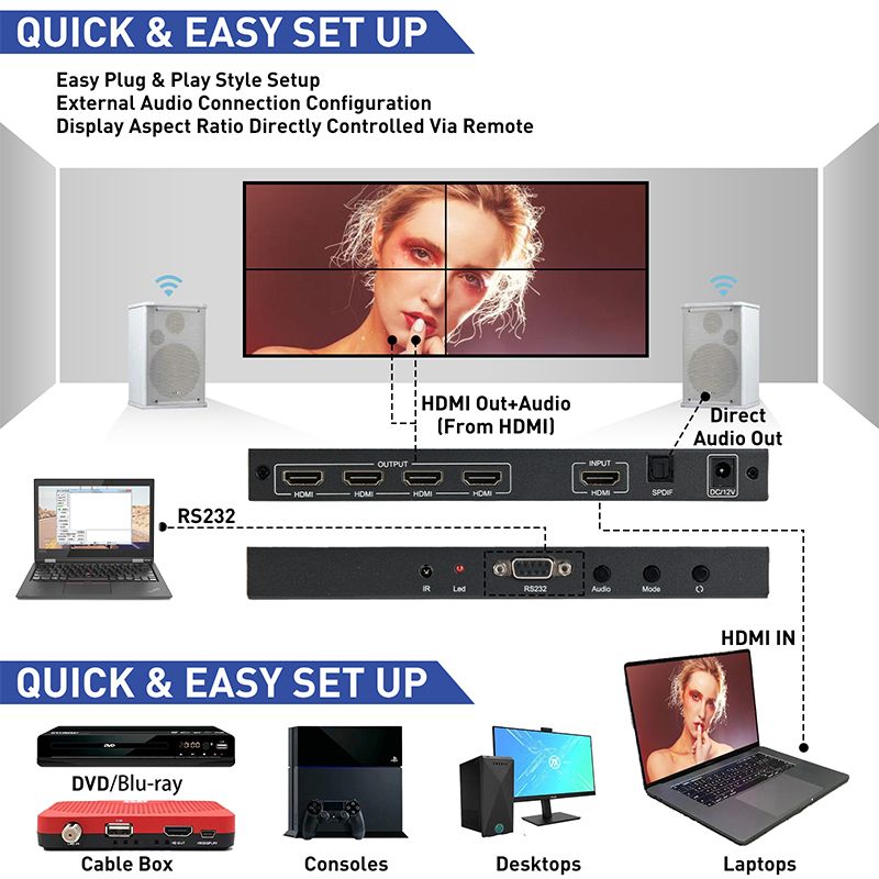 DE/VT-VWUHD1 (RS-232) поддерживает 1 вход 4K HDMI и 1 вход USB, поддерживает разрешение 1920x1080P@60Hz с коррекцией рамки. + управление через RS-232.