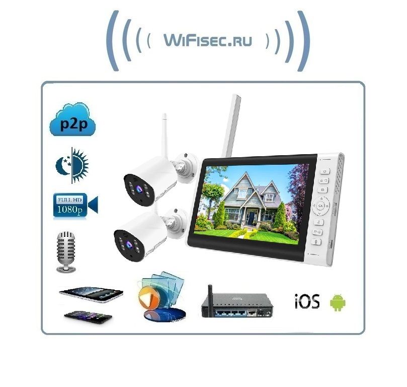 Комплект системы беспроводного видеонаблюдения, монитор 7" с NVR и 2 уличные видеокамеры с аудиоканалом, Full HD (Xmeye PRO)