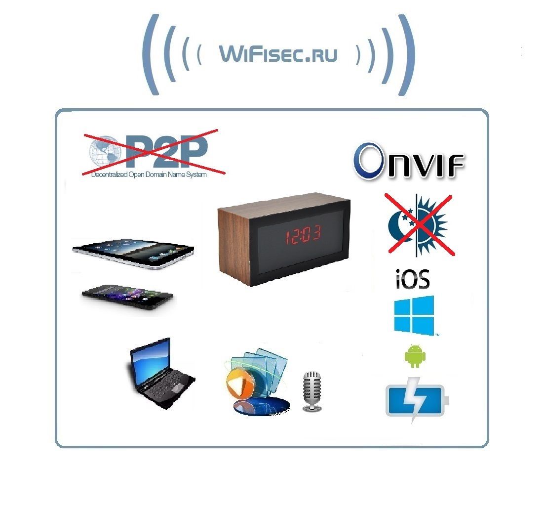 Видеоняня с углом обзора 170 градусов HD 720p и интерфейсом работы по WiFi каналу. Уникальное исполнение в виде электронных настольных часов (информатор времени, месяц и число, температура). Встроенный аккумулятор позволяет работать видеоняне 1 час без питания в сети 220 В. Возможность записи на micro SD карту аудио и видео (карта памяти в комплект не входит). Протокол Onvif. Просмотр и управление с планшетов/ПК/ноутбуков на базе ОС Android/IOS. Устройство имеет свою WiFi сеть. Вы сможете подключиться к устройству напрямую и работать с ним. После интеграции в Вашу локальную WiFi сеть, будет доступен сервис P2P (Возможность просмотра с любой точки земли через интернет не имея выделенного IP). Питание часов осуществляется от трёх пальчиковых батарей типа АА.