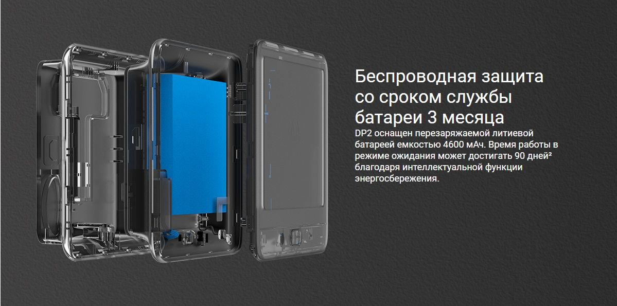 EZVIZ CS-DP2C-A0-6E2WPFBS оснащен встроенным литиевым аккумулятором на 4600 мА/ч и обеспечивает длительное время автономной работы с минимальным энергопотреблением.