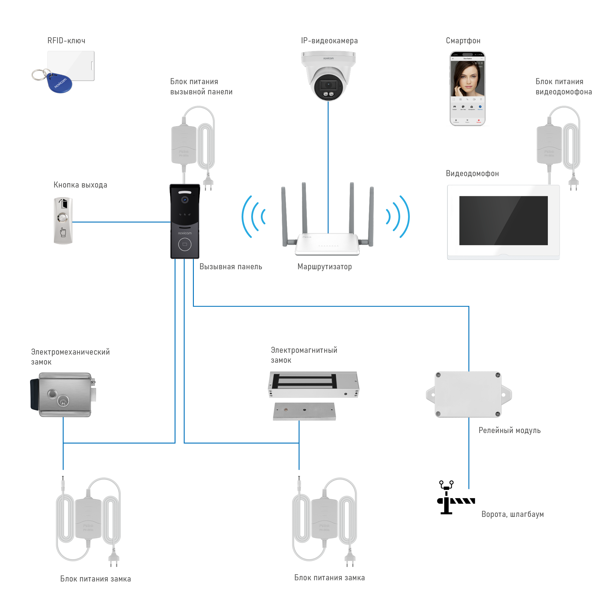 К видеодомофону можно подключить до 9 вызывных панелей, до 8 IP-камер, а также 9 дополнительных видеодомофонов.