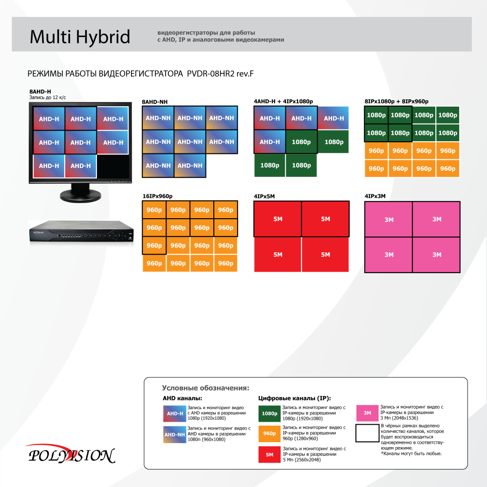 | Поддерживаемые камеры | 4x1080P (AHD-H)/4x720P (AHD-M)/4xAHD-L/ 4x1080P@18fps(AHD)+4x1080P(IP)/ 4x5M/4x3M/8x1080P+8x960P/16x960P | |