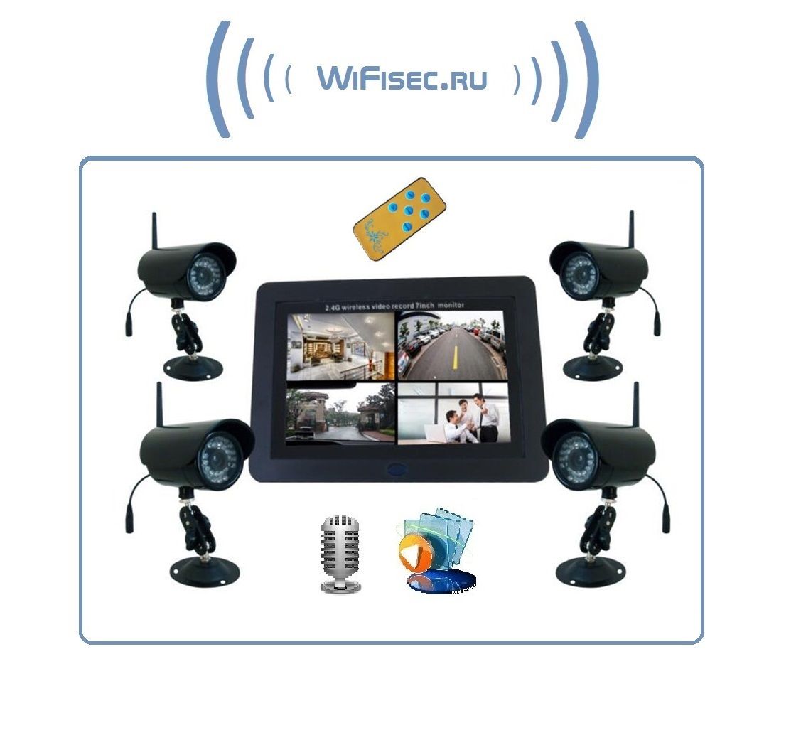Готовый комплект системы видеонаблюдения (замкнутая система, не нужен роутер, связь монитор - камера) Пыле и влагозащищённая беспроводная телекамера - 4 штуки с ночным видением и аудиоканалом + Хороший монитор:7'' TFT LCD, система цветности PAL/NTSC . Ставим в любое место в Вашей квартире/помещении, на улице. Подключаем питание. Запись видео и аудио всех 4 каналов производится на мониторе на СД карту (приобретается отдельно, тип SD) или на ПК (через кабель USB). В комплекте пульт управления с полным набором функций. На мониторе есть функция сканирования каналов (до 4). Отображение в квадро просмотре сразу 4 беспроводных телекамер, режим листания по каналам. На мониторе есть выход для подключения к большому монитору, а так же линейный выход аудиоканала. Дальность связи по прямой видимости около 150 метров. Аудио прослушивание. Система не виснет. Надёжная связь даже в условиях перекрытий и бетонных стен.