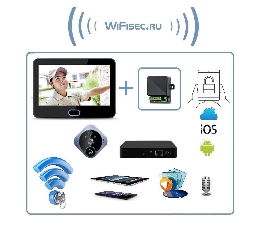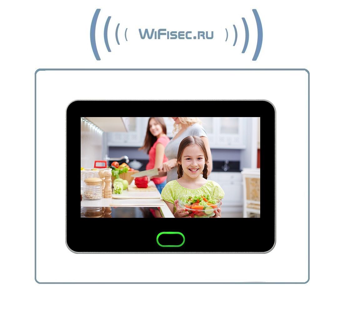 Автономная надверная панель вызова с качеством картинки HD 720P, 1.2 Mp и монитор LCD с диагональю экрана 7" работает по собственной приватной беспроводной связи с шлюзом по частоте 2,4 Ггц на расстоянии до 200 м по прямой видимости.