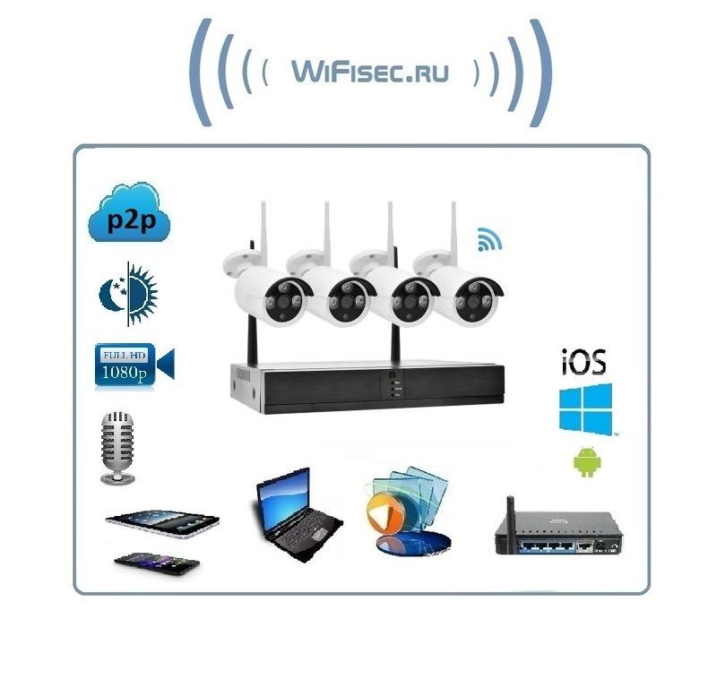 NVR+4IPC 3M Wi-Fi Комплект беспроводной системы видеонаблюдения, видеорегистратор + 4 видеокамеры, FullHD (XMeye)