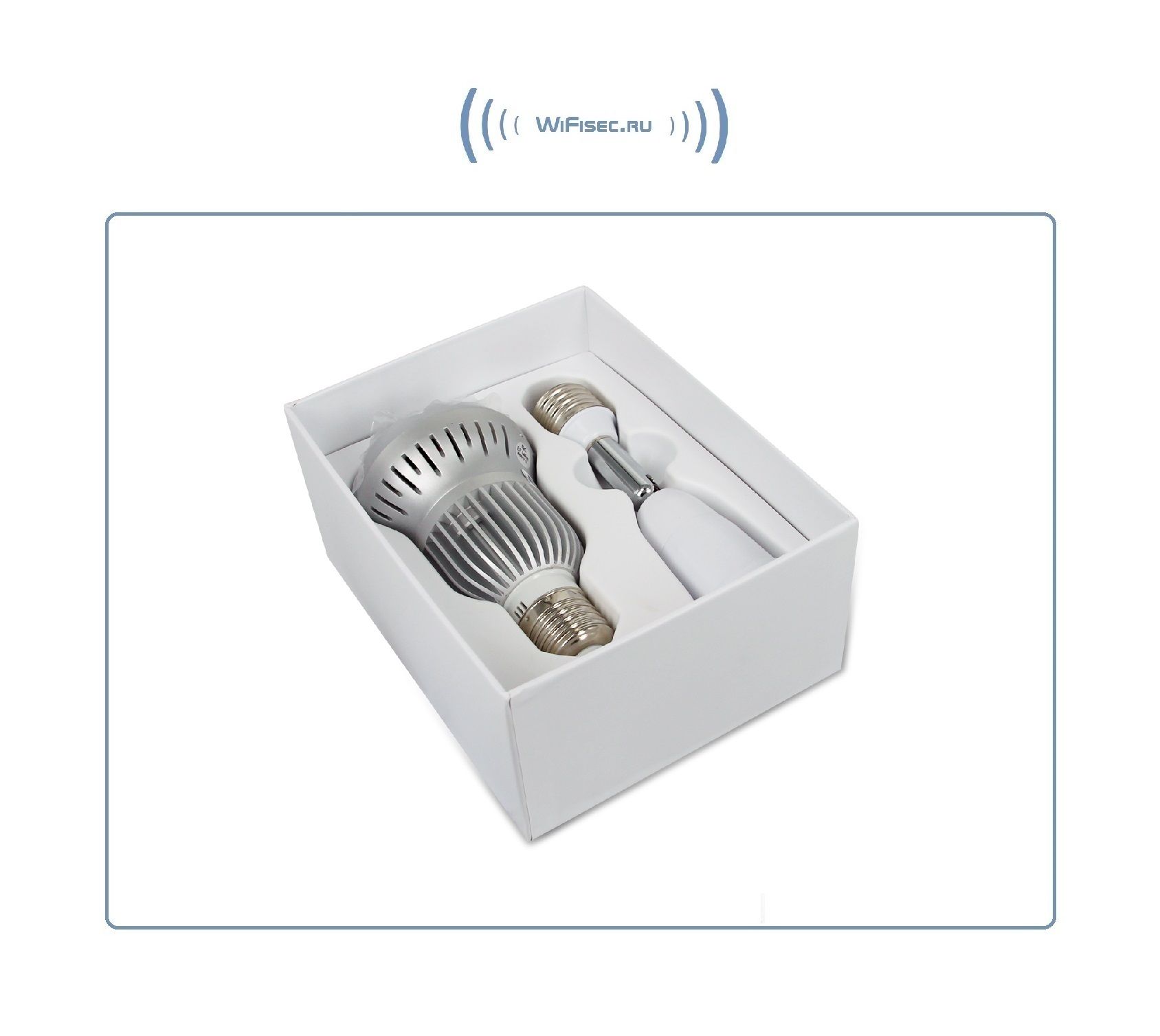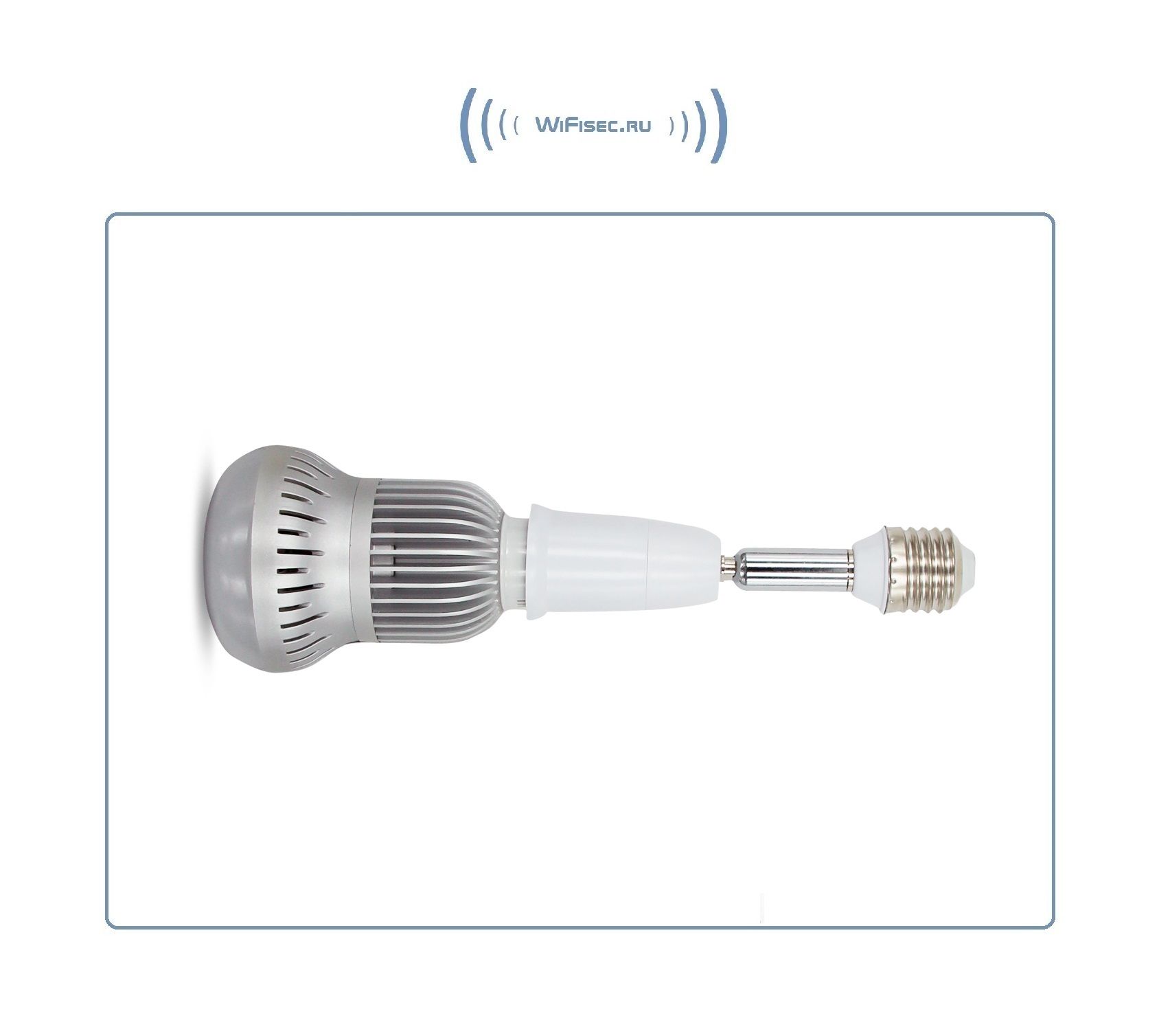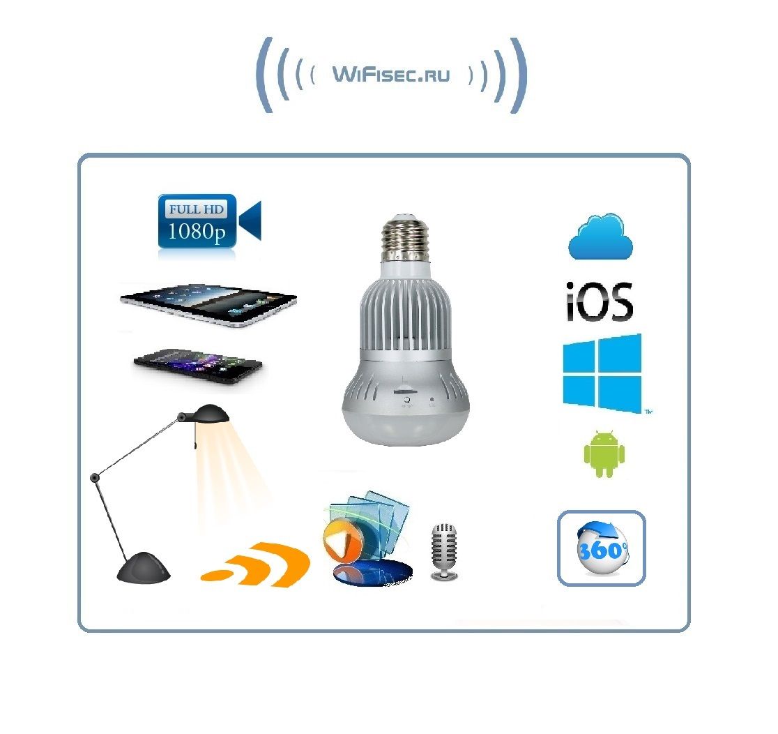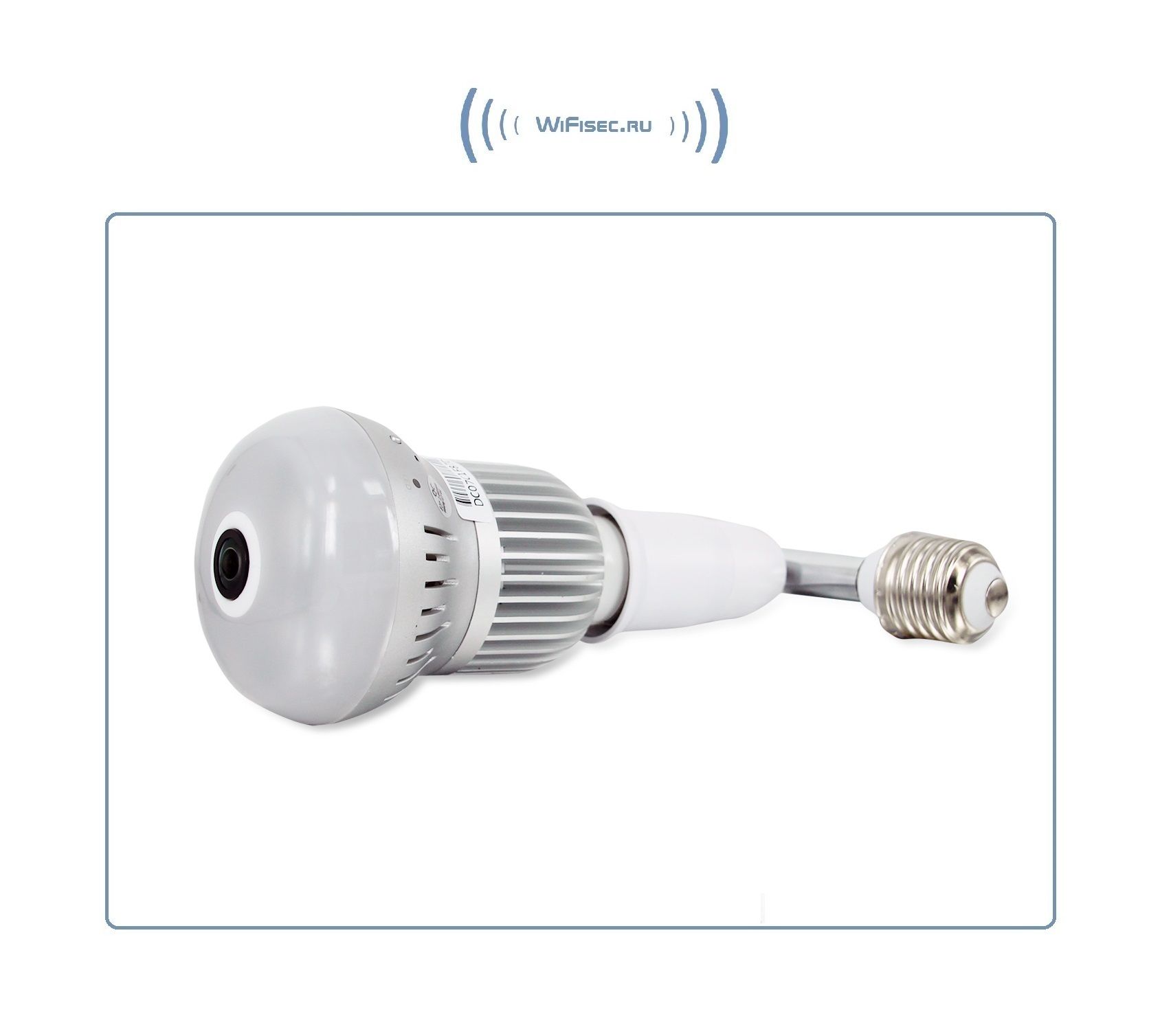 WiFi видеоняня, она же IP видеокамера в виде лампы накаливания. Вкручивается в цоколь Е27. Для удобства, в комплекте идёт адаптер (гибкий удлинитель), он позволяет направить IP видеокамеру в место обзора. Угол обзора у этой модели WiFi видеокамеры 360 градусов. Вы видите всю площадь обзора без искажений. Мобильное приложение позволяет смотреть сцену обзора в 5 - ти разных шаблонах. Встроенный микрофон и динамик в камеру, позволяет вести интерком связь с местом обзора с Вашего мобильного приложения. В устройство встроен видеорегистратор, запись ведётся на микро СД карту памяти объёмом до 128 Гб.
