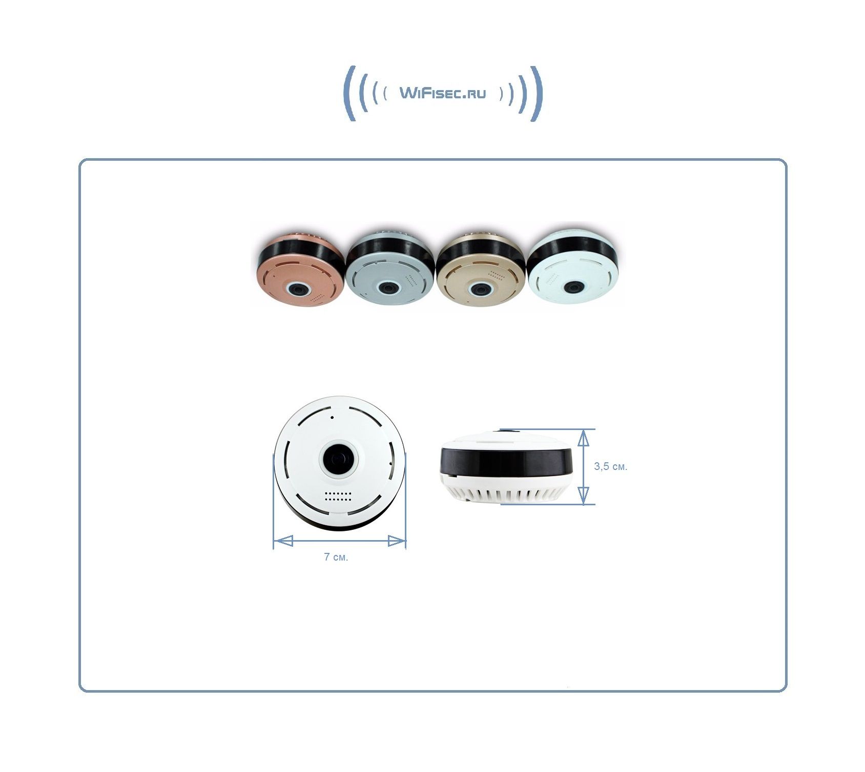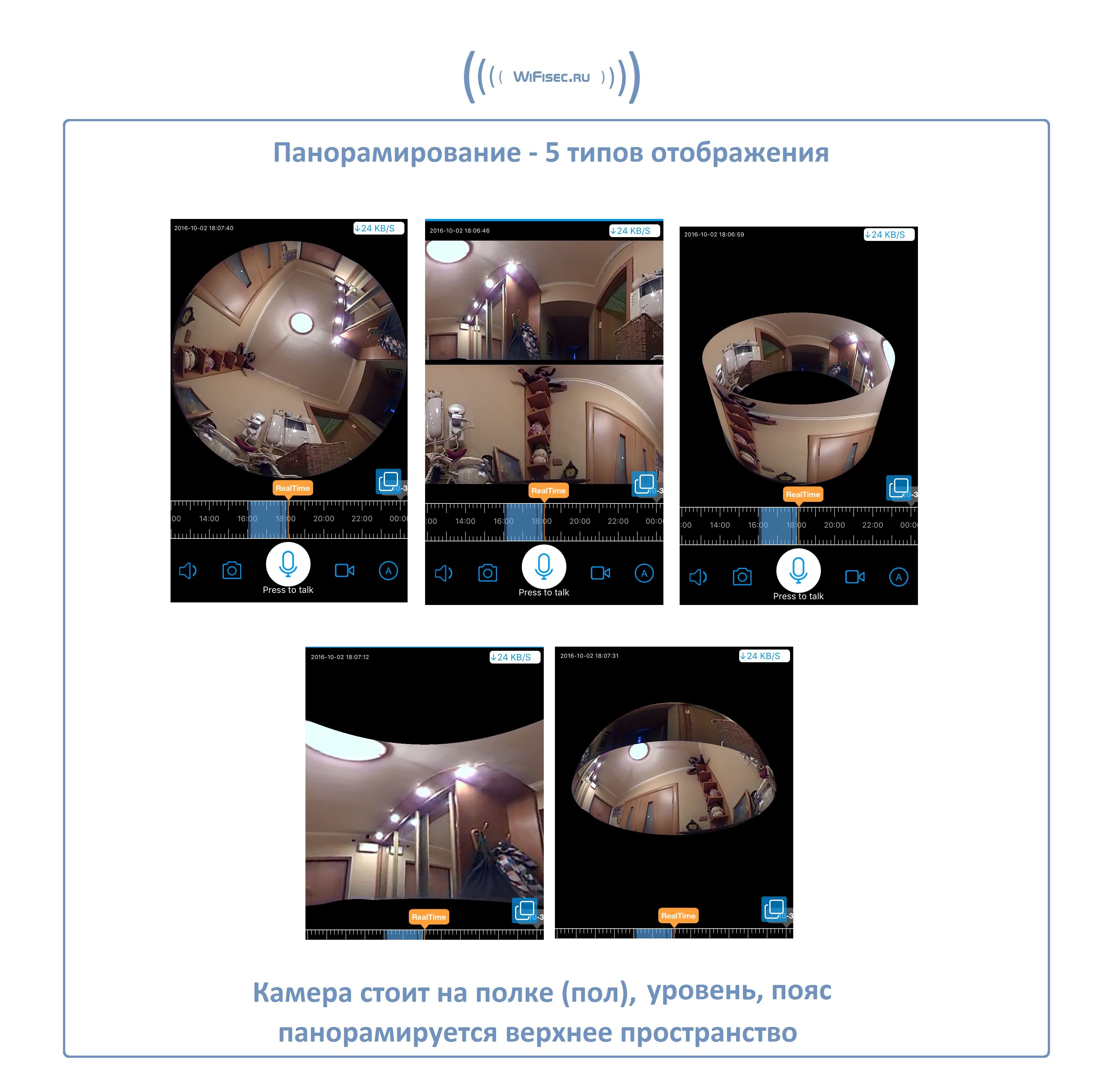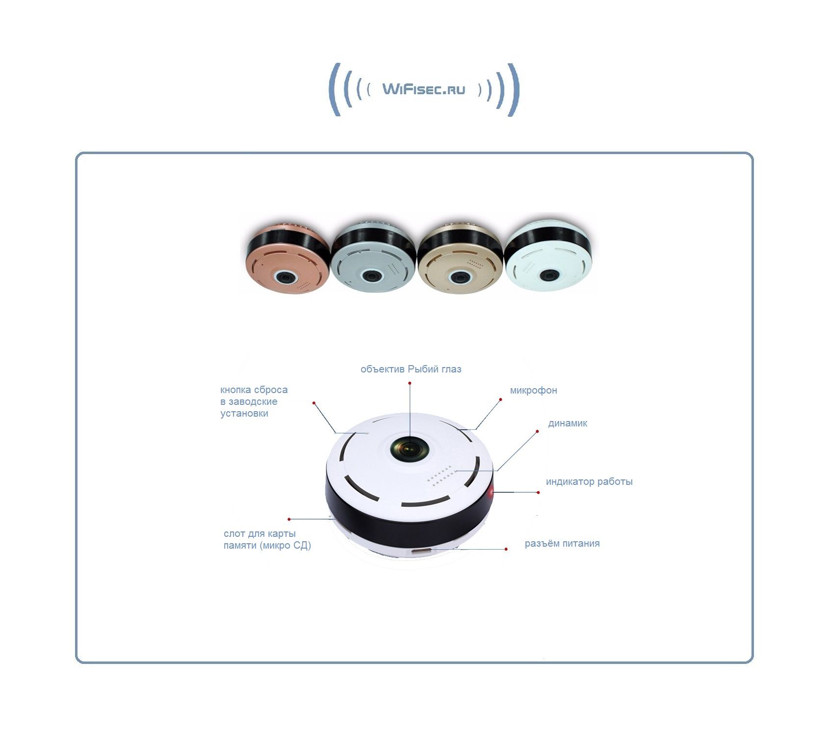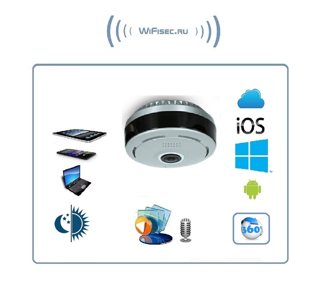 WiFi видеоняня/видеокамера с уникальной технологией объектива Рыбий глаз. Угол обзора такого объектива составляет 360 градусов. Эту модель можно расположить на потолке или полу (полке), на стене. Видит всё в зоне плоскости установки 360 градусов вокруг. Встроенный софт мобильного приложения позволяет просматривать в обычном режиме, без искажений всю зону осмотра в 5 режимах. Режим панорамирования распространяется на всё записанное видео и сделанные фото. Вы видите всё и с увеличением в хорошем качестве. Запись видео и аудио непосредственно производится на изделие на микро СД карту памяти (при заказе выбирайте в разделе аксессуары). Например - карта памяти в 32 Гб обеспечивает архив в 21 день. Интерком связь с активным подавлением шума. Ночное видение. Встроенный детектор движения. Сервис P2P (доступ из любой точки мира посредством интернет связи). Совместимость с ОС IOS, Android. Просмотр через ПК по локальной сети (ОС Windows).