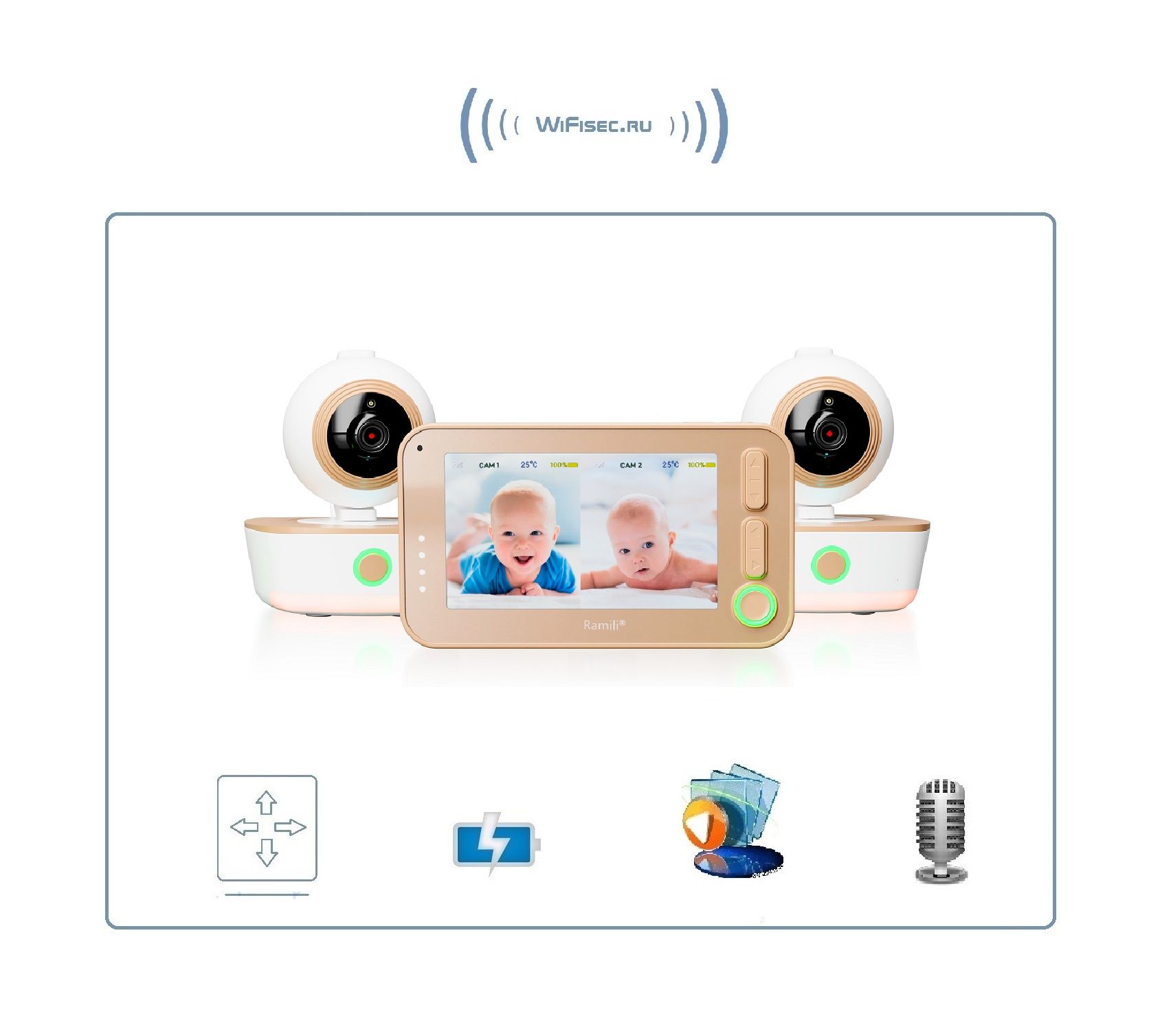 Ramili® Baby RV1300X2. Предназначена для наблюдения за ребенком на расстоянии до 300 метров. Оснащена поворотной камерой и монитором с дисплеем 10.9 см (4.3 дюйма), между которыми обеспечена надёжная и безопасная цифровая связь с системой преодоления помех. Камера располагается в детской комнате и передаёт на экран монитора видео и звук высокого качества.