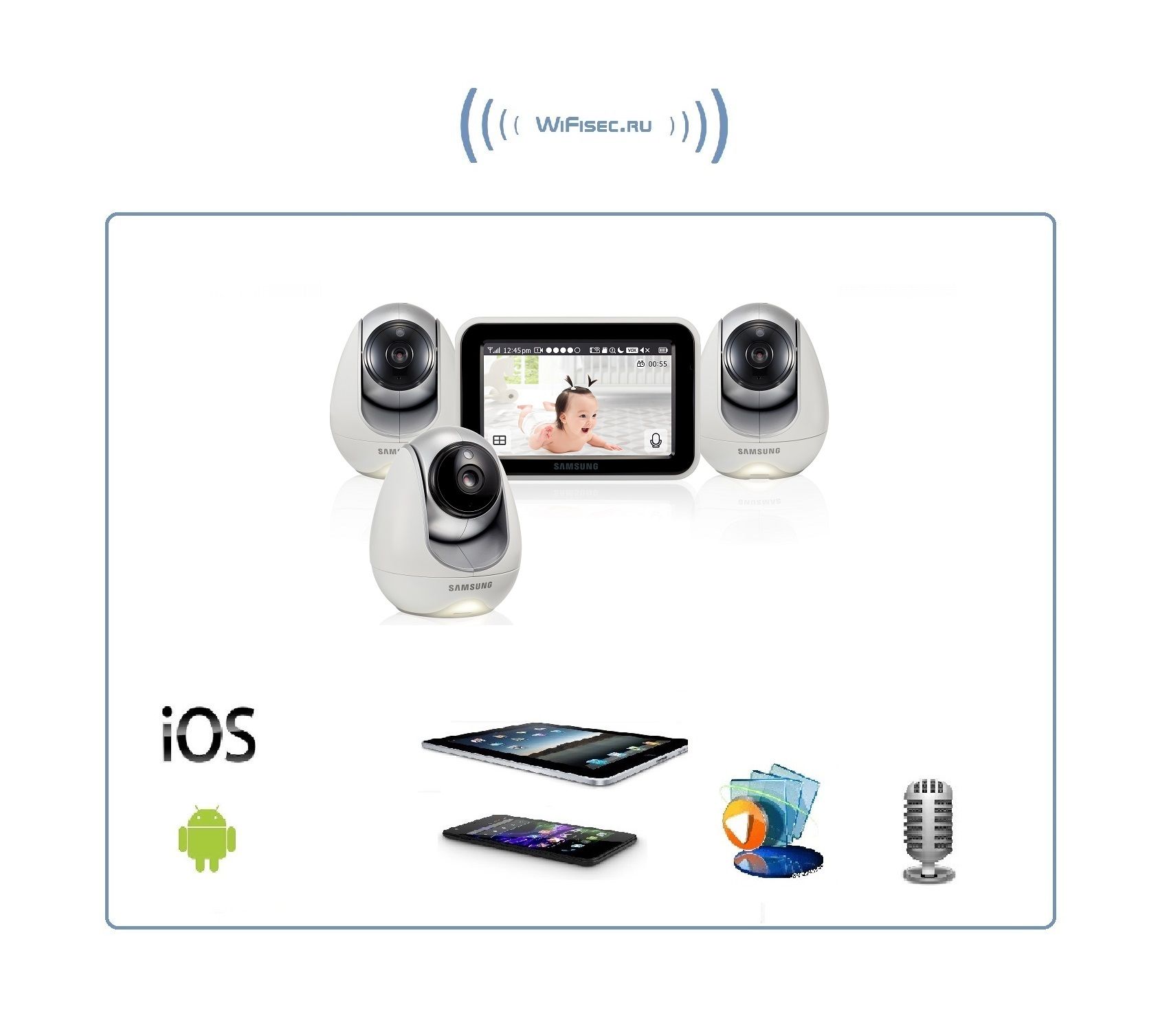 Samsung, двухрежимная видеоняня Samsung SEW-3053WPX2 (Wi-Fi и FHSS) с сенсорным монитором и моторизированной видеокамерой (3 шт.) с DVR и P2P, HD