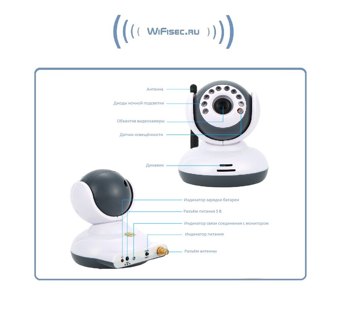 Устойчивая радиосвязь между блоками осуществляется на частоте 2,4 GHz без помех на расстоянии до 100 метров в зоне прямой видимости. Есть инфракрасная подсветка камеры, невидимая человеческим глазом, позволяющая вести съемку на расстоянии до шести метров практически в полной темноте. Если родительский блок случайно окажется вне зоны досягаемости передатчика, не беда – видеоняня оснащена звуковой сигнализацией на этот счет. Чувствительный микрофон является одновременно датчиком звука – уловив малейший шорох или шум, видеоняня переключается из режима ожидания в рабочий режим.