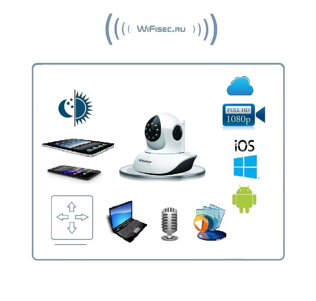 VStarcam C8838WIP - это простая и удобная в использовании беспроводная Wi-Fi IP-камера с FULL HD качеством видео (1920 на 1080 пикселей), технологией P2P (работа без статического IP-адреса, функцией поворота, двусторонней аудиосвязью (динамик+микрофон) и ИК подсветкой для ночного видения.