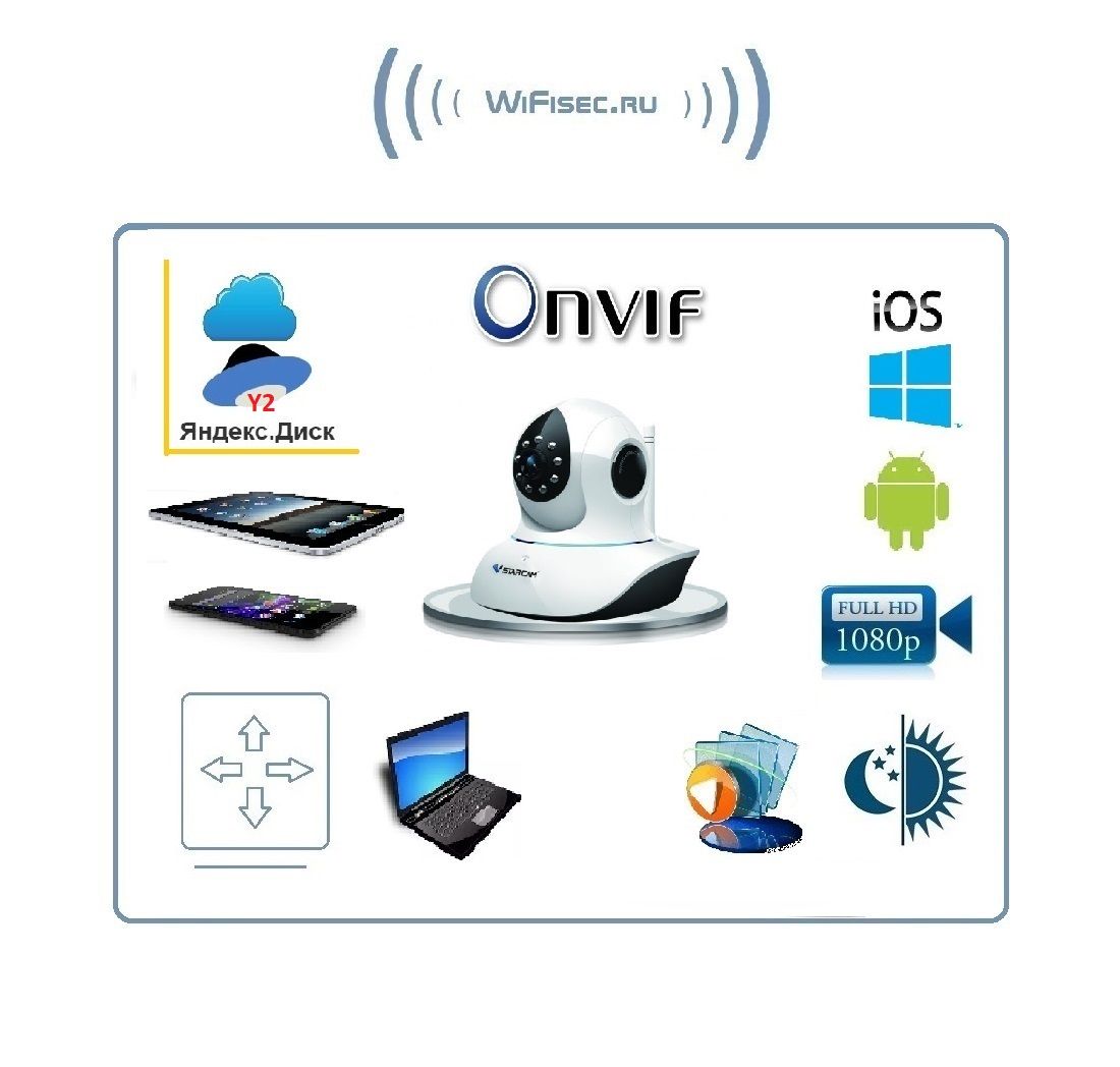 Vstarcam Y8838WIP-y2 (Я-диск) - это удобная и простая в использовании беспроводная Wi-Fi IP-камера с 1920x1080 (Full HD) качеством видео, технологией P2P (работа без статического IP-адреса, функцией поворота, двусторонней аудиосвязью (динамик+микрофон) и ИК подсветкой для ночного видения. Камера поддерживает простое подключение по звуку, а также протоколы RTSP и Onvif для подключения к регистраторам и сервисам наблюдения.