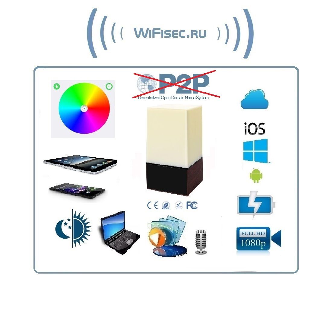 Видеоняня с углом обзора 120 градусов Full HD 1080p и интерфейсом работы по WiFi каналу. Уникальное исполнение в виде настольного светильника. Регулировка включения светильника + цветовая схема с мобильного устройства. Встроенный аккумулятор позволяет работать видеоняне 2-3 часа без питания в сети 220 В. Возможность записи на micro SD карту аудио и видео (карта памяти в комплект не входит). Просмотр и управление с планшетов и мобильных устройств а базе ОС Android/IOS + ПК/ноутбуков через софт и ВЭБ-клиент. Устройство имеет свою WiFi сеть. Вы сможете подключиться к устройству напрямую и работать с ним. После интеграции в Вашу локальную WiFi сеть, будет доступен сервис P2P (Возможность просмотра с любой точки земли через интернет не имея выделенного IP).