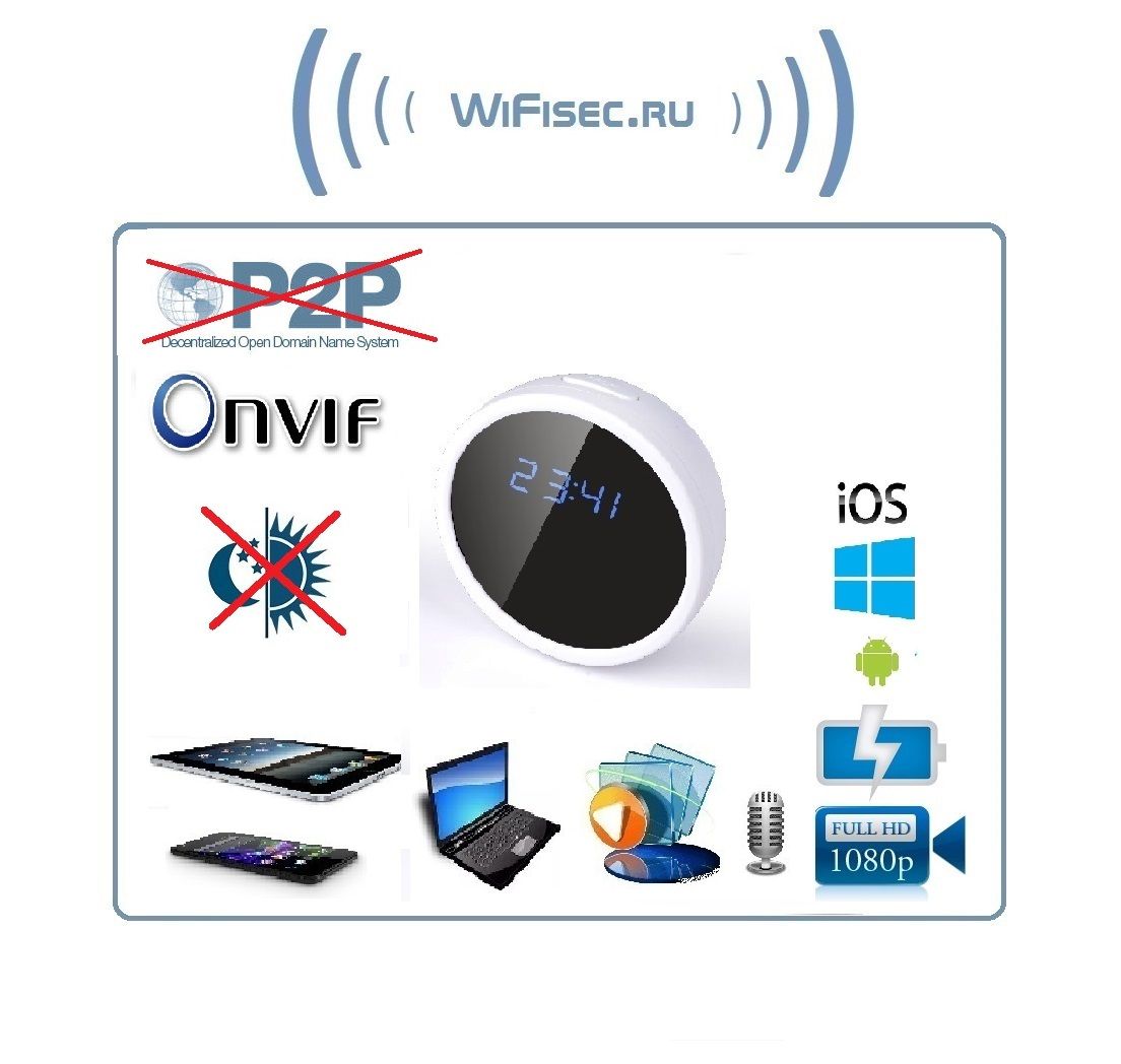 Видеоняня DE-W08A с углом обзора 90 градусов Full HD 1080p и интерфейсом работы по WiFi каналу. Уникальное исполнение в виде электронных настольных часов (табло показывает время, месяц+число и и месяц поочерёдно). Возможность записи на micro SD карту аудио и видео (карта памяти в комплект не входит). Встроенный аккумулятор позволяет автономно работать устройству в течение 2-3 часов. Протокол Onvif позволяет интегрировать изделие с сетевым IP видеорегистратором. Просмотр и управление с планшетов/ПК/ноутбуков на базе ОС Android/IOS. Устройство имеет свою WiFi сеть. Вы сможете подключиться к устройству напрямую и работать с ним. После интеграции в Вашу локальную WiFi сеть, будет доступен сервис P2P (Возможность просмотра с любой точки земли через интернет не имея выделенного IP).