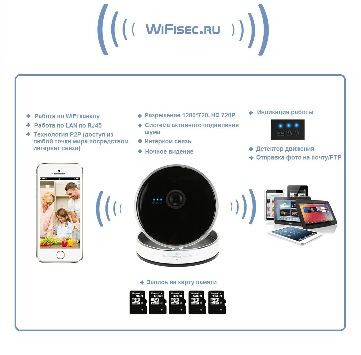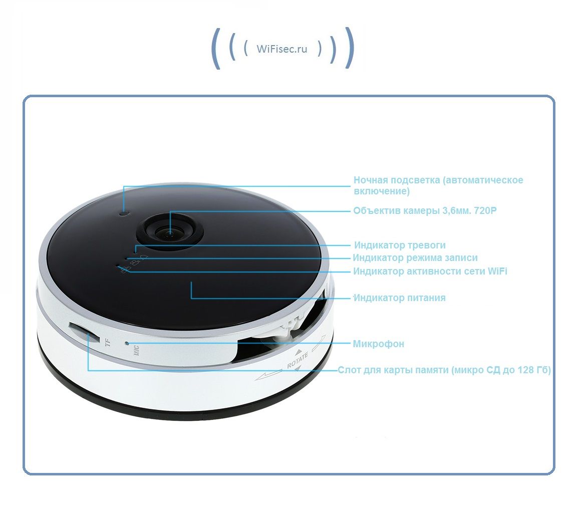 WiFi-LAN видеокамера с встроенным видеорегистратором, который позволяет записать на карту памяти видео и звук (объём карты памяти до 128 Гб. карта памяти в комплект не входит).